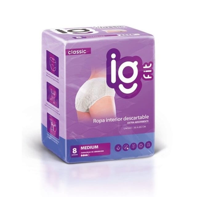 IG Fit® es una bombacha descartable con cintura multielástica adaptable. Posee núcleo con polímeros que brindan una rápida absorción neutralizando los olores. De fácil reconocimiento: frente y dorso diferenciales. Con barreras antidesbordes que evitan filtraciones en la entrepierna adaptándose perfectamente al cuerpo.